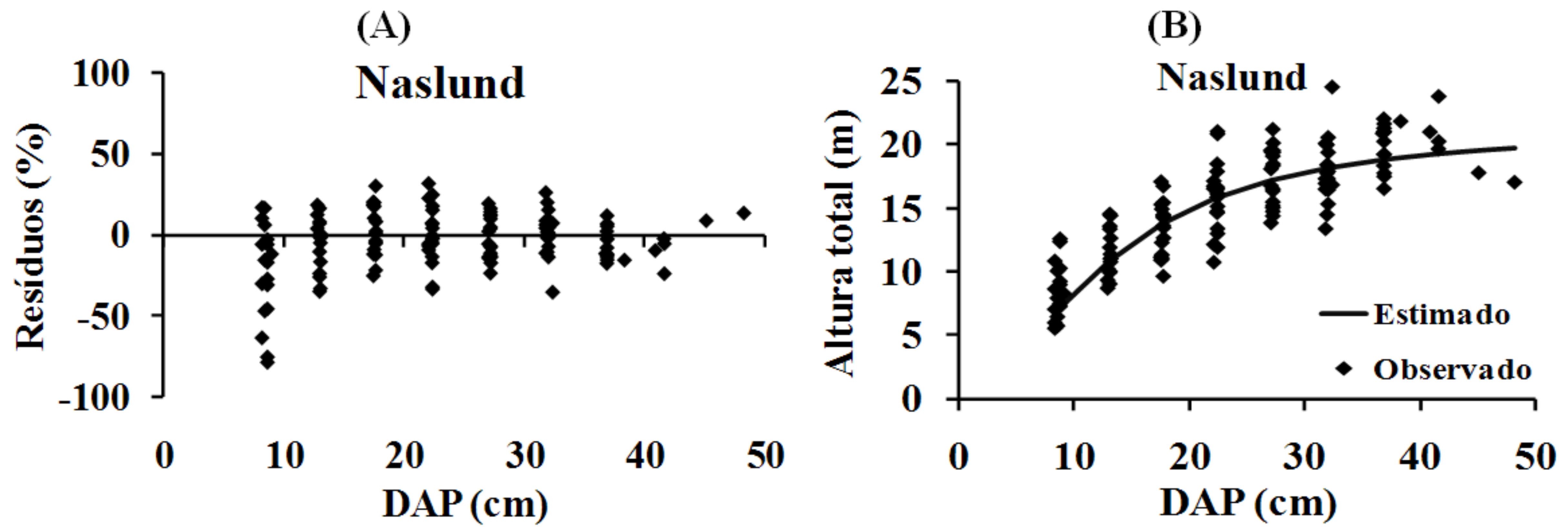 O objetivo do presente trabalho foi ajustar modelos de distribuição diamétrica, relação hipsométrica, afilamento e volume, a fim de caracterizar as relações dendrométricas para Pinus sp. em fragmentos remanescentes de povoamentos da década de 1970 na região da Reserva de Desenvolvimento Sustentável Veredas do Acari, norte do estado de Minas Gerais. Foi realizada a identificação dos fragmentos de Pinus sp. e efetuado o seu mapeamento. Foram coletados dados biométricos das árvores para as modelagens da distribuição diamétrica, relação hipsométrica, afilamento e volume individual. O critério de seleção dos modelos consistiu na avaliação do coeficiente de determinação ajustado, erro padrão da estimativa em porcentagem, teste F, significância dos coeficientes de regressão e análise gráfica de resíduos. A função Beta e os modelos de Naslund, Max-Burkhart e Schumacher-Hall são adequados para descrever, respectivamente, a distribuição diamétrica, a relação hipsométrica, o afilamento e o volume individual para Pinus sp. em fragmentos de povoamentos da década de 1970 no estado de Minas Gerais.Downloads